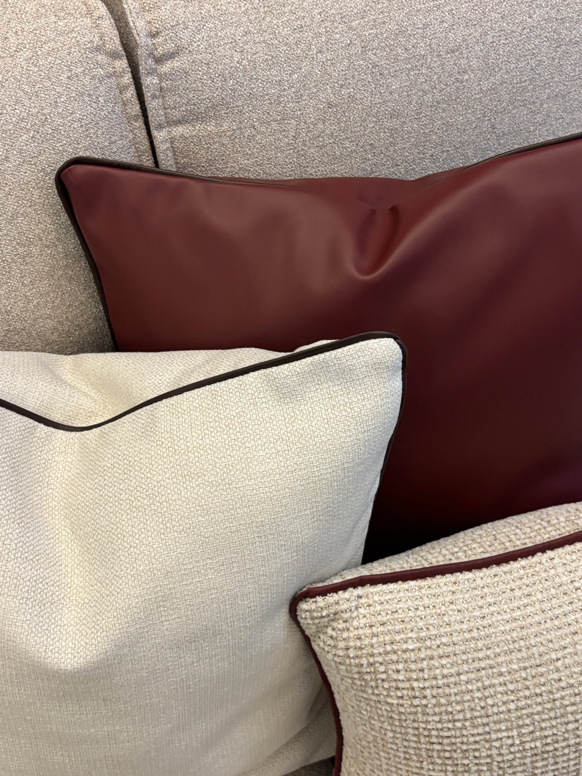 Bordo suni deri kırlent kenarlarında kahverengi suni deriden ince fitil var. Ürün içsiz sadece kılıf olarak satılmaktadır. Ürünler 45x45 ve 50x30 ölçüdür. 45x45 yüksek oranda evdeki standart içlere uymaktadır.