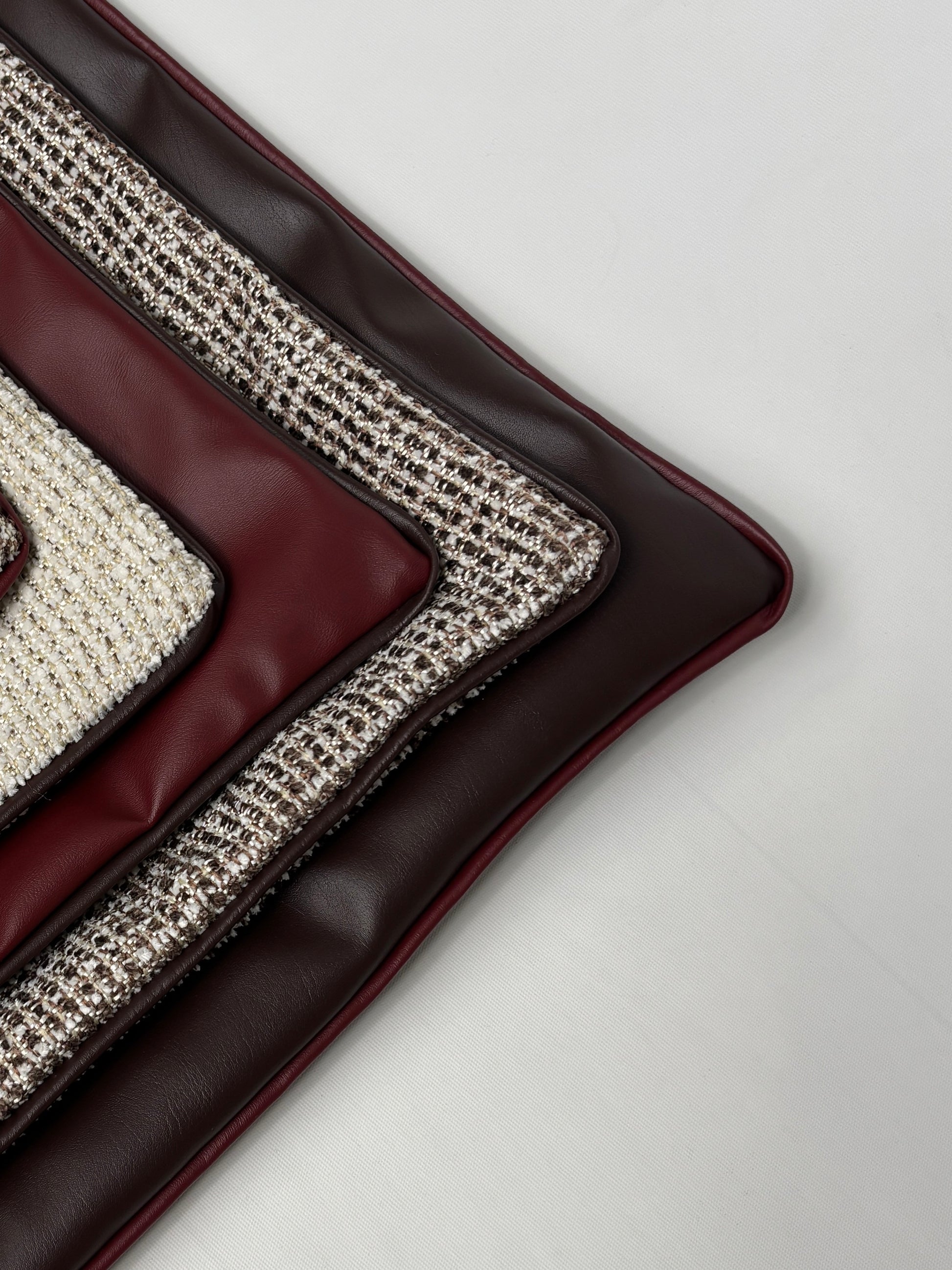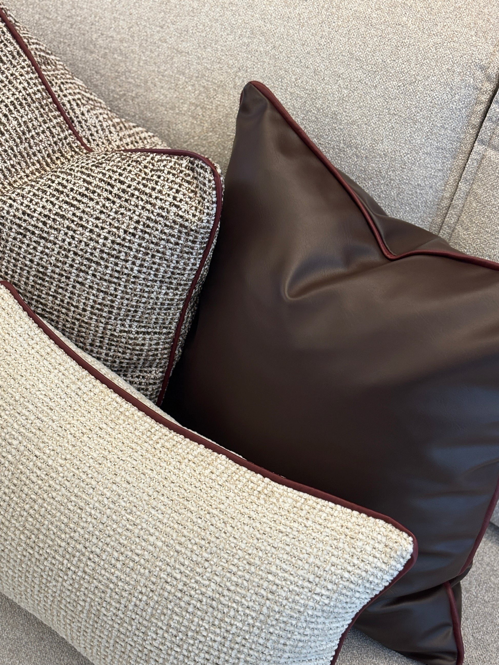 Koyu kahverengi suni deri kırlent kenarlarında bordo suni deriden ince fitil var. Ürün içsiz sadece kılıf olarak satılmaktadır. Ürünler 45x45 ve 50x30 ölçüdür. 45x45 yüksek oranda evdeki standart içlere uymaktadır.